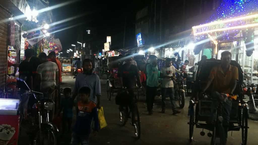 চাঁদরাতের বেচাকেনা চলবে সারারাত, দোকান বন্ধ হবে না। ঈশ্বরদী স্টেশন রোড থেকে রাত ১টায় তোলা দৃশ্য। ছবি: স্বতঃকণ্ঠ ঈশ্বরদী