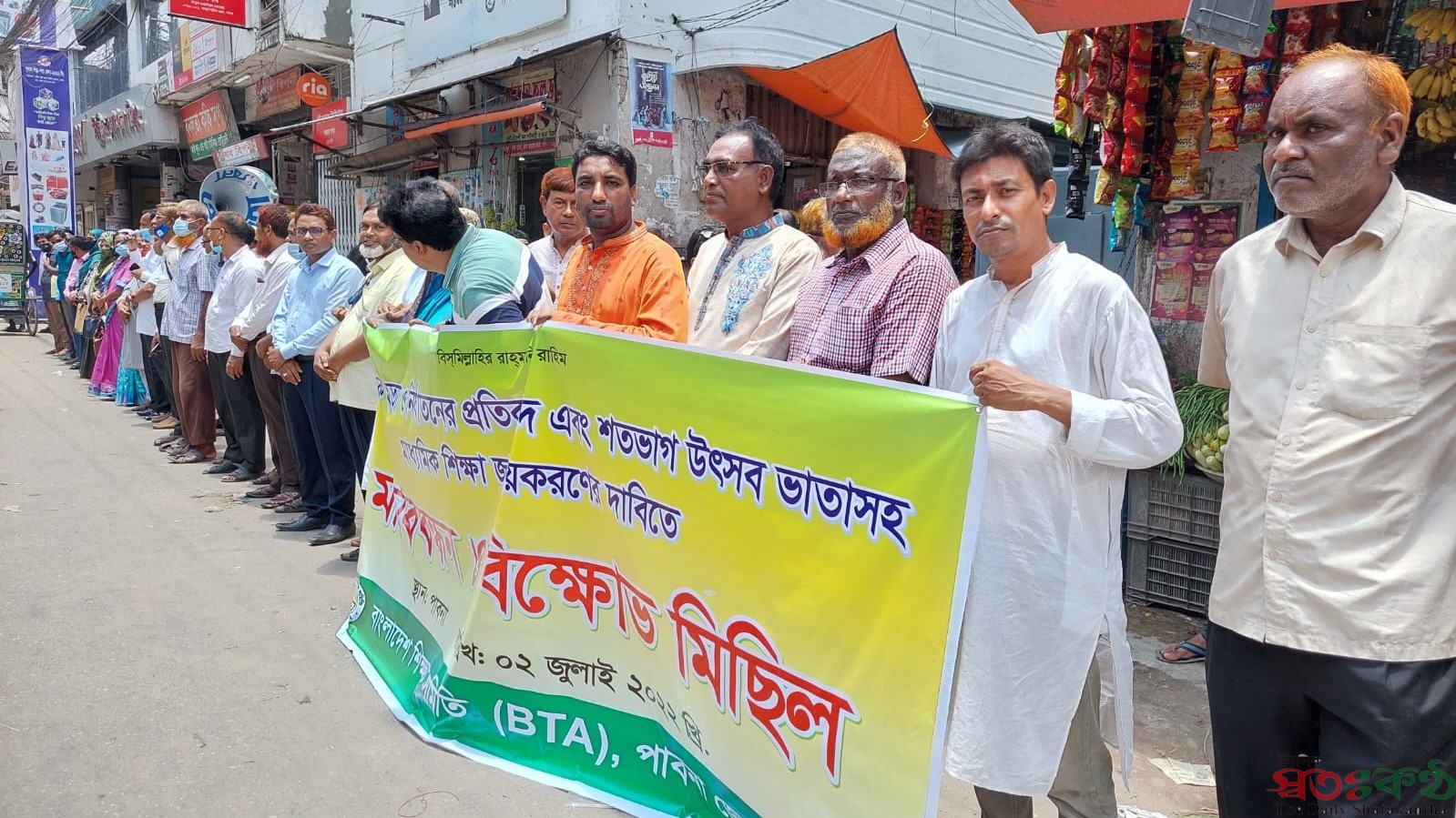 শিক্ষক উৎপল কুমার সরকারকে হত্যার প্রতিবাদে, শতভাগ উৎসব ভাতা ও মাধ্যমিক শিক্ষা জাতীয়করনের দাবীতে পাবনায় মানববন্ধন। বার্তা সংস্থা পিপ (পাবনা)