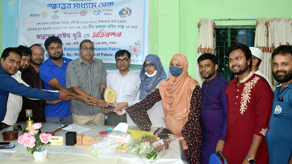 রোটার্যাক্ট ক্লাবের উদ্যোগে মেডিক্যাল কলেজের শিক্ষার্থী বৃষ্টিকে সংবর্ধনা। পাবনা সংবাদদাতা প্রকাশিত: ৬:১২ অপরাহ্ন, সেপ্টেম্বর ১০, ২০২২ আর কে আকাশ, পাবনা: