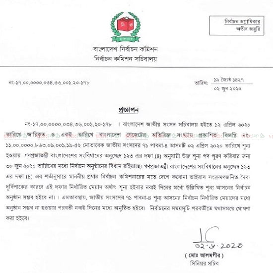 এমতাবস্থায়, নির্বাচন কমিশনের এক প্রেস বিজ্ঞপ্তিতে জানানো হয়, জাতীয় সংসদের ৭১ পাবনা-৪ (ঈশ্বরদী-আটঘরিয়া) আসনটি গত ২ এপ্রিল ২০২০ তারিখে শুন্য হওয়ায় গণপ্রজাতন্ত্রী বাংলাদেশের সংবিধানের ১২৩ এর দফা (৪) অনুযায়ী উক্ত শুন্য পদ পূরণ করার জন্য আগামী ৩০ জুন ২০২০ তারিখের মধ্যে নির্বাচন সম্পন্ন করার বিধান আছে।