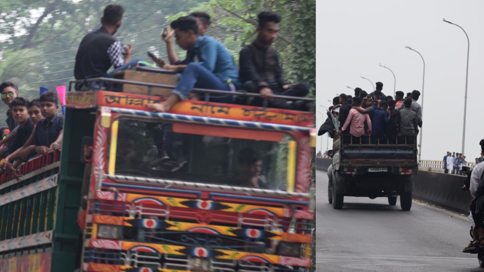যেখানে এই যানবাহন গুলো মহাসড়কে চলচলই নিষিদ্ধ সেখানে এসব যানবাহনে গাদাগাদি করে চড়েছে ছেলেরা। অনেকেই অতি উৎসাহী হয়ে চড়েছেন এসব গাড়ীর ছাদে।